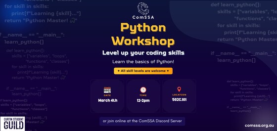Join us for a beginner-friendly Python Workshop designed for students of all year levels who are interested in learning how to code or strengthening their programming fundamentals. Whether you're in your first semester or nearing graduation, this workshop will introduce you to the core concepts behind programming and help you better understand how coding works. It's a great opportunity to build confidence for your coursework, future units, or personal projects. No prior experience is required, and you don’t need to be a computing student to attend, anyone interested in learning Python or picking up a new skill is welcome. Bring your laptop and come try coding with us! 🧑‍💻